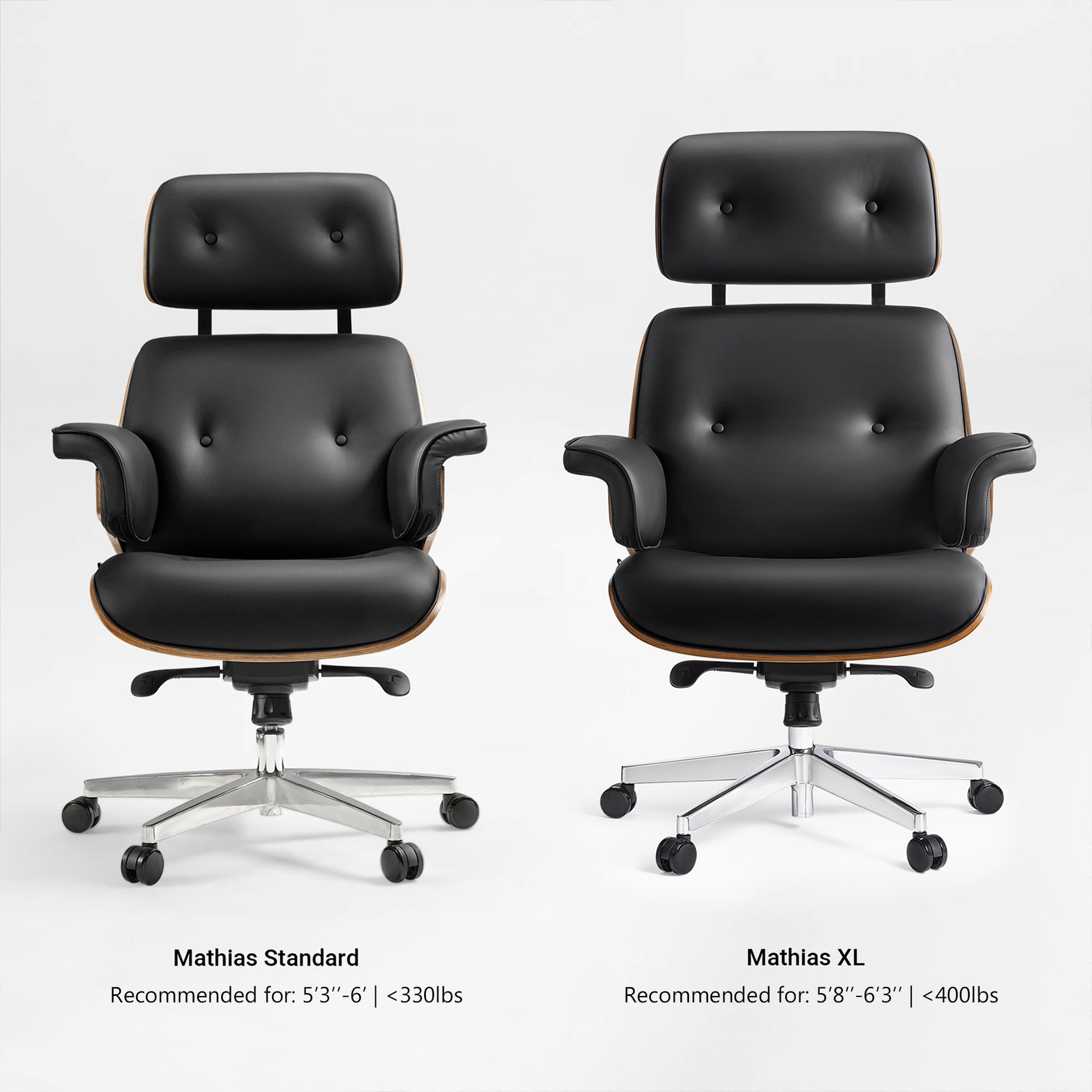 I purchased the Mathias, Napa Leather Executive Office chair for my husband for Christmas this year. He is so hard to buy for, and he had been complaining about his home office chair for some time. I searched high and low for the right replacement that was not only comfortable, but also something that would be a decorative touch to his office. This chair fits the bill perfectly. It matches my Eames Lounge Chair perfectly and my husband says that it is so comfortable to sit in. He tells me constantly how much he likes his new office chair, and wants me to order another one for his law office. It was delivered on time and easy enough for me to put together by myself. Overall, a great experience. I highly recommend this chair.