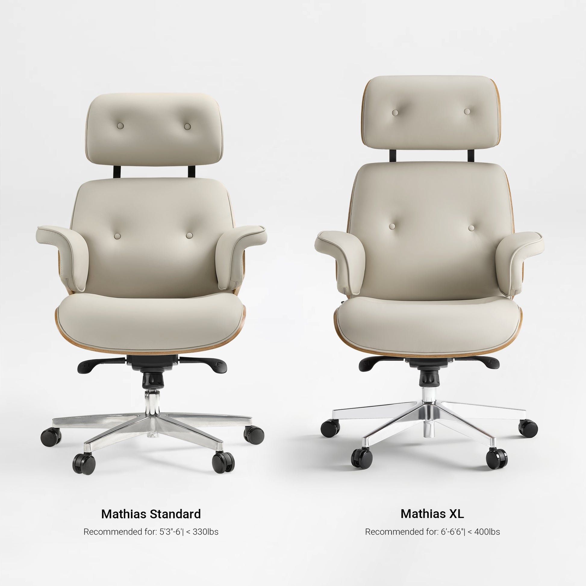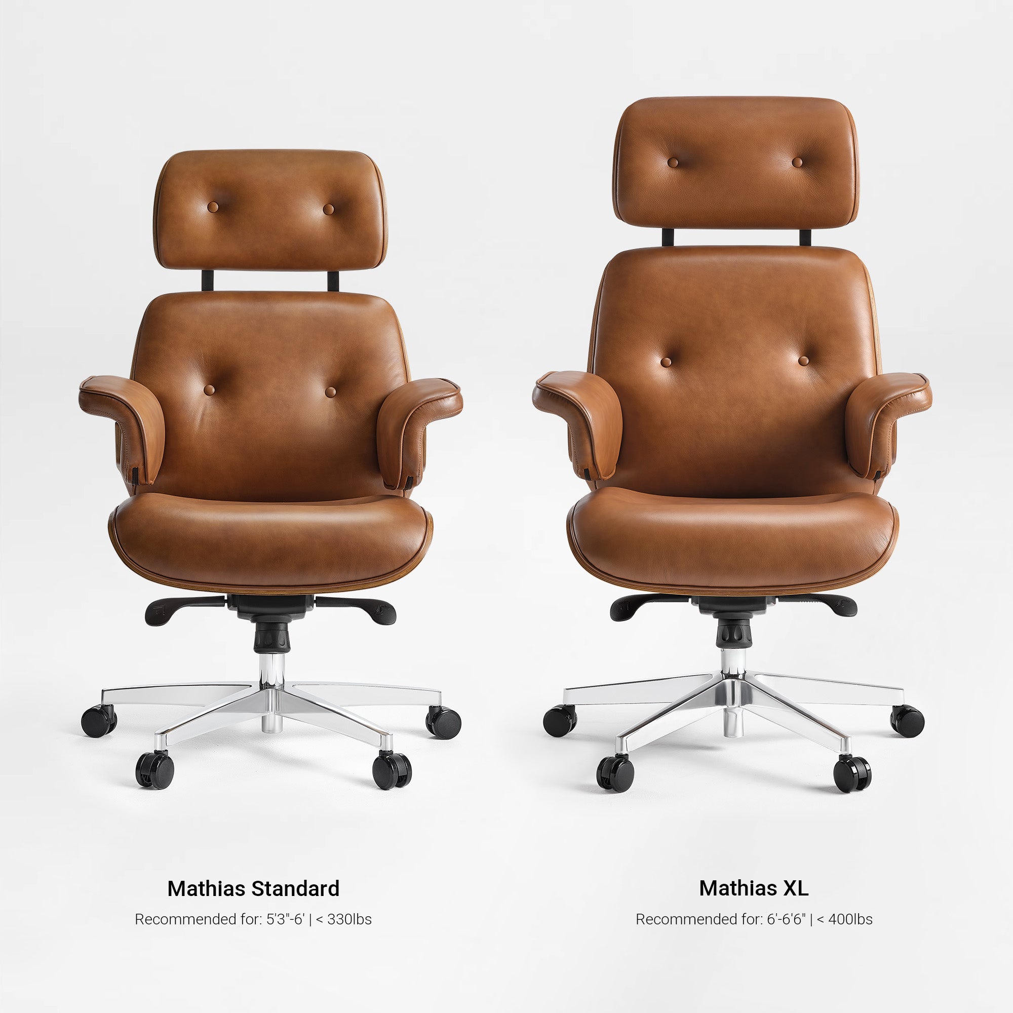 I purchased the Mathias, Napa Leather Executive Office chair for my husband for Christmas this year. He is so hard to buy for, and he had been complaining about his home office chair for some time. I searched high and low for the right replacement that was not only comfortable, but also something that would be a decorative touch to his office. This chair fits the bill perfectly. It matches my Eames Lounge Chair perfectly and my husband says that it is so comfortable to sit in. He tells me constantly how much he likes his new office chair, and wants me to order another one for his law office. It was delivered on time and easy enough for me to put together by myself. Overall, a great experience. I highly recommend this chair.