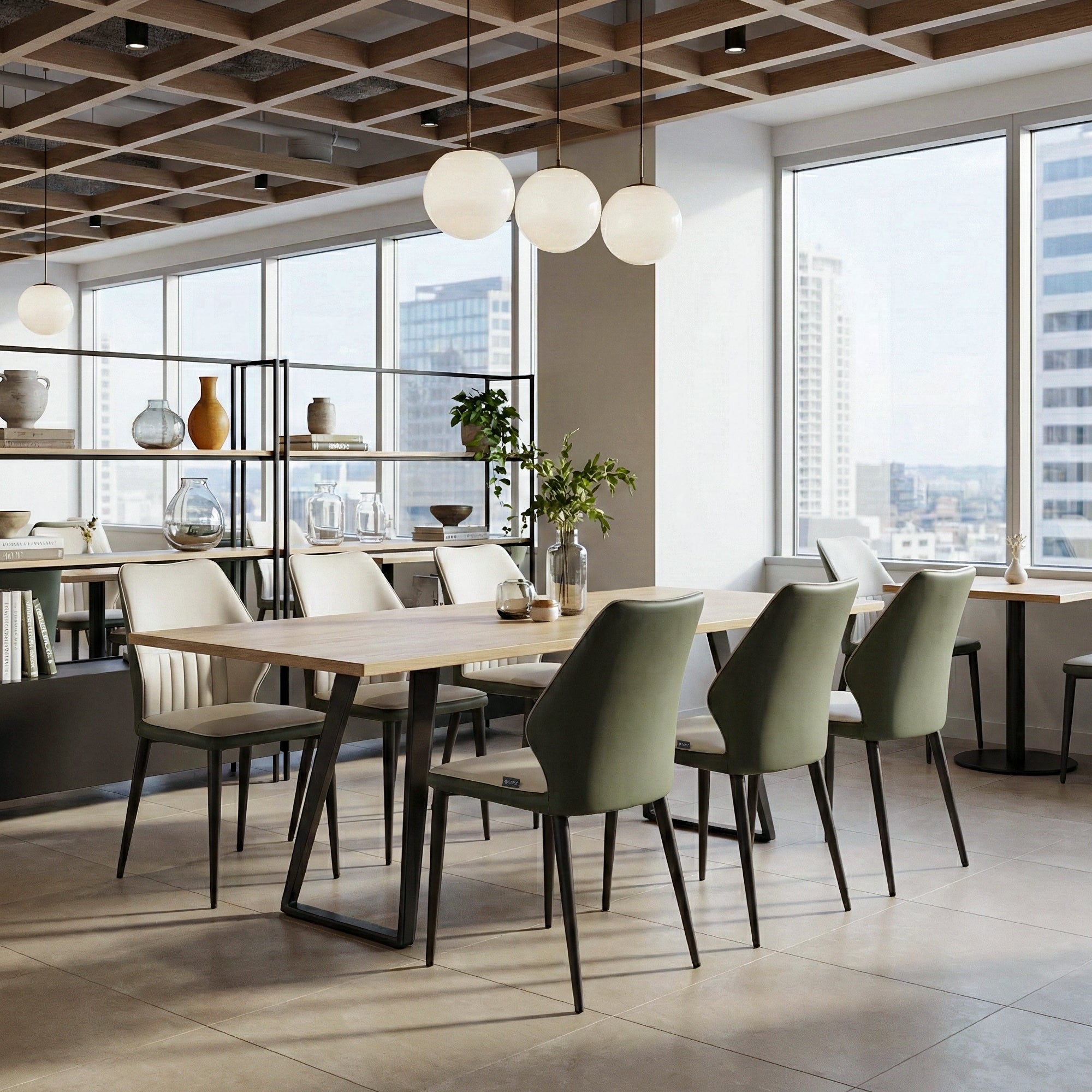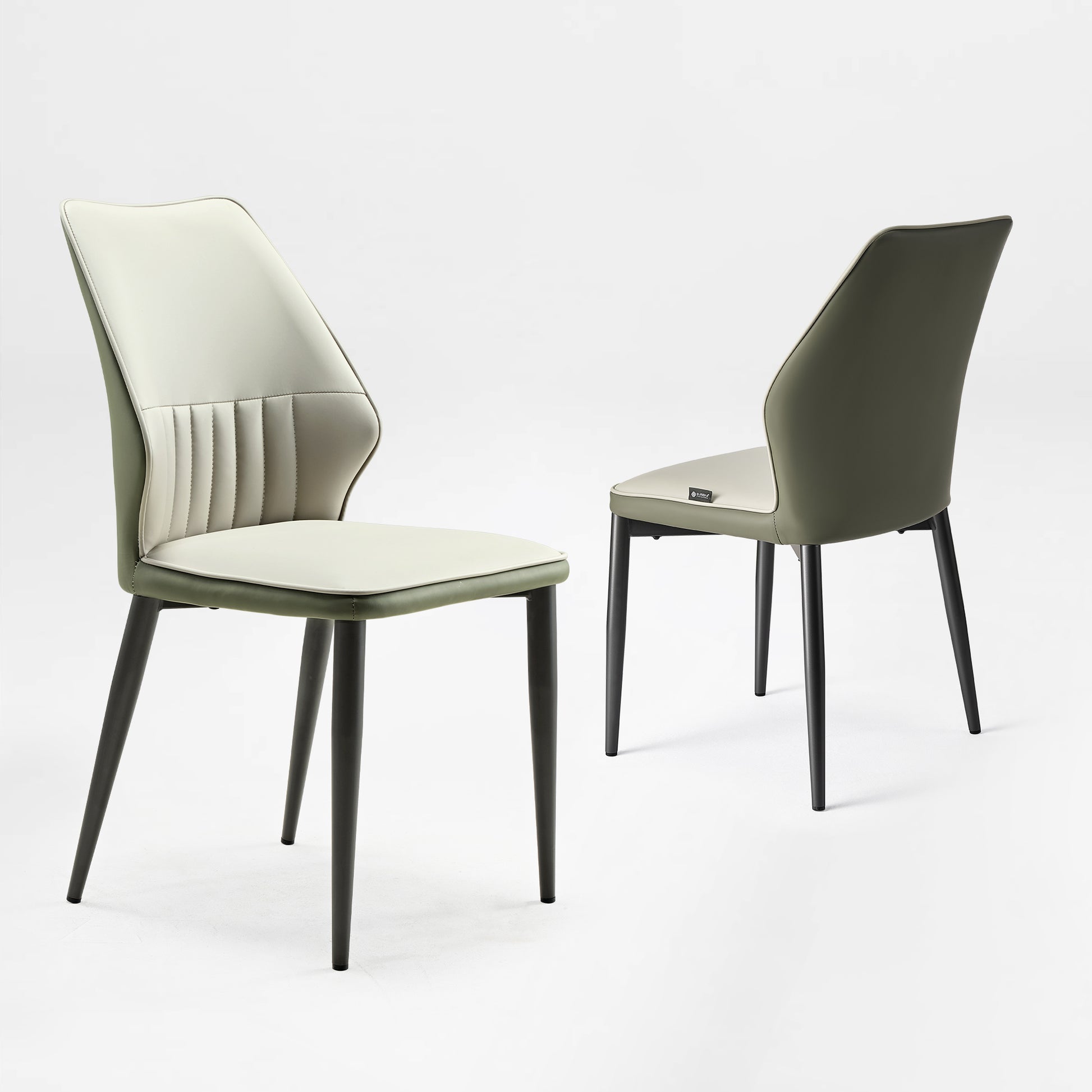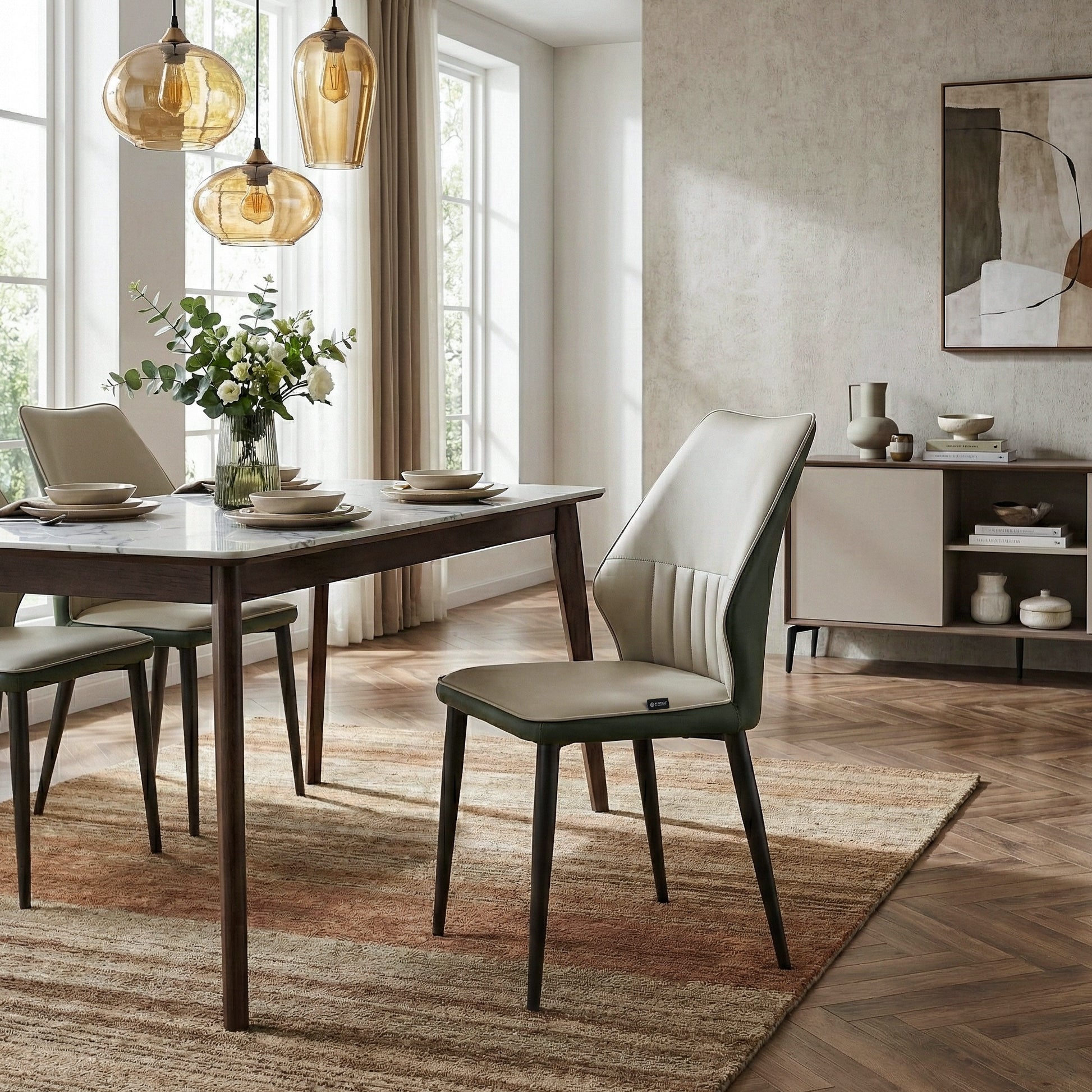 These two-tone green and beige chairs are the ideal fit for our mix of botanical wallpaper and exposed brick.