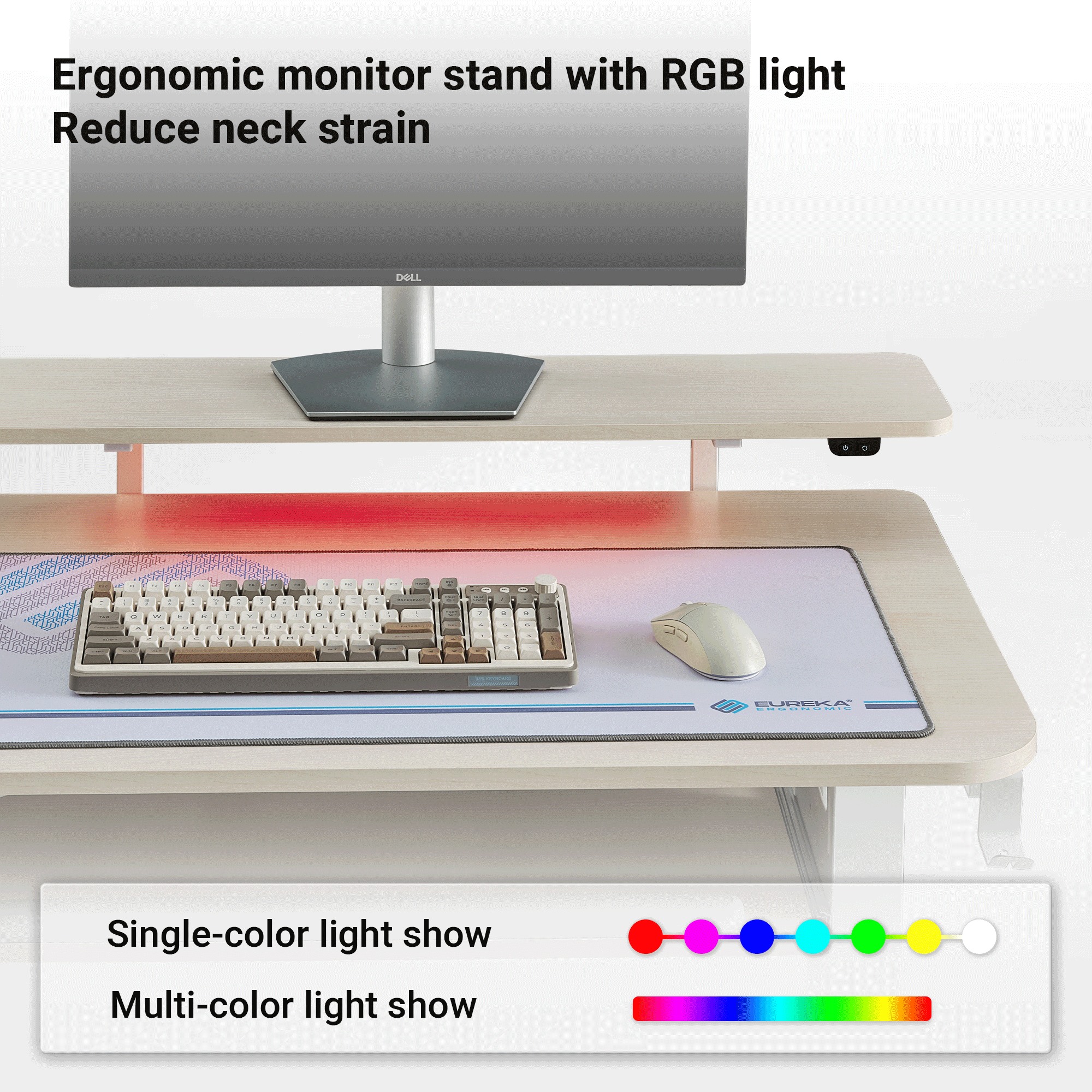 • Ergonomic Monitor Stand with Controllable RGB Lighting: The 28 7/8" ergonomic monitor riser is big enough to accommodate single-monitor and double-monitor setups. By raising your monitors to eye level, the ergonomic monitor riser promotes a healthy posture and frees up usable desk space. RGB ambient lighting under the monitor riser enhances your environment and lets you change the mood of your setup with the push of a button.