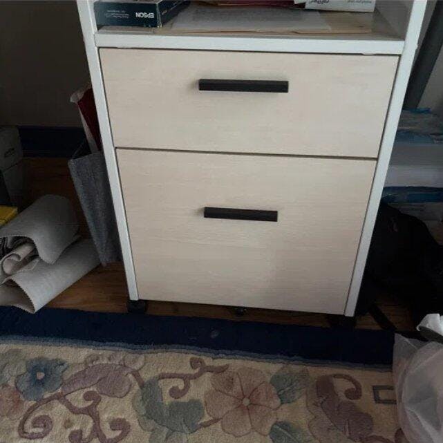 Say goodbye to desk chaos and meet your desk's new BFF — a stylish rolling file cabinet with two spacious drawers and a practical bag for all your files. The open shelf provides additional space for your printer, paper, knick-knacks, and your favorite photos.