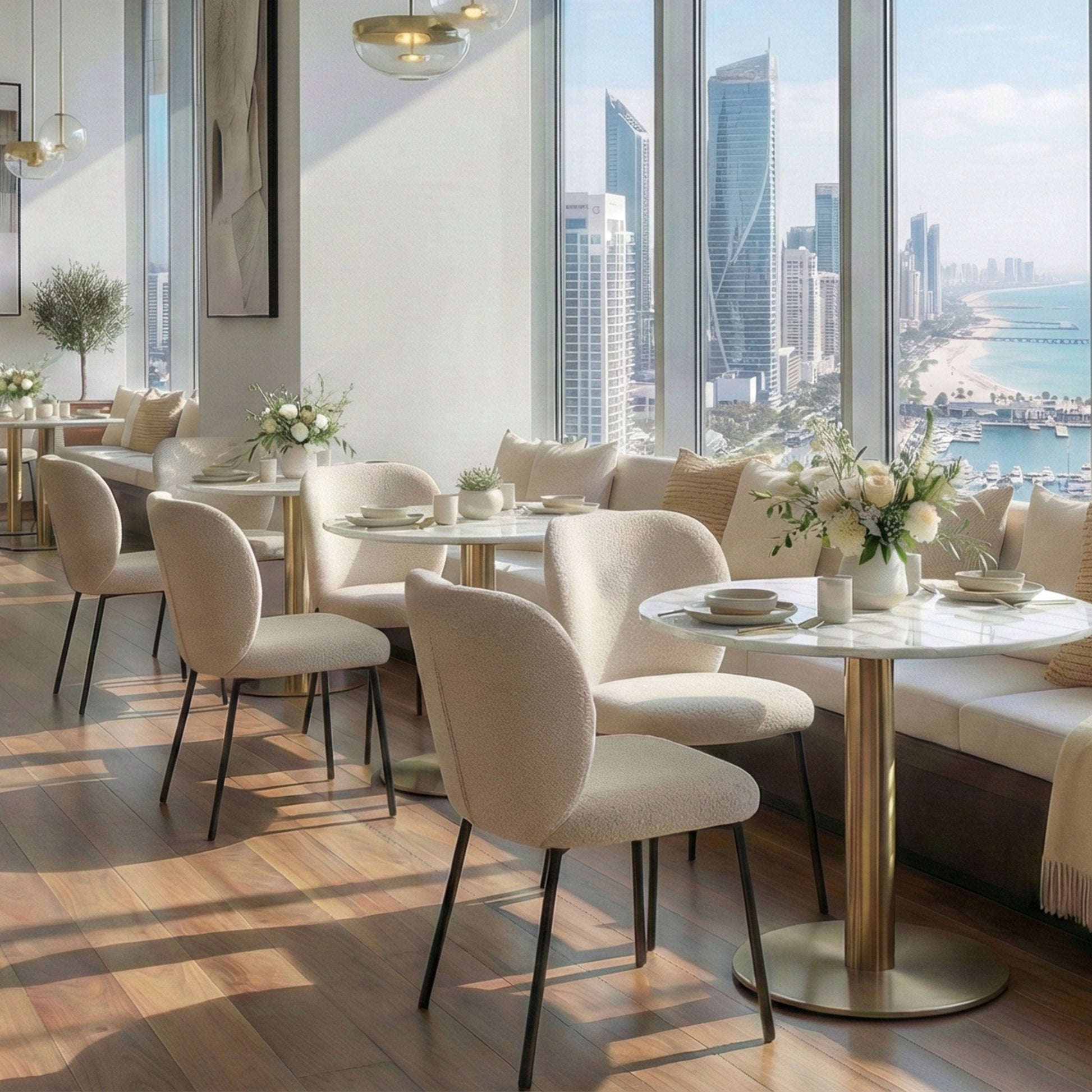 Modern and minimalistic, with a cozy seating experience, this modern minimalistic dining chair blends into your dining space with its sleek design and warm hues, creating a comfortable and inviting dining atmosphere that reflects the owner's pursuit and appreciation of minimalist aesthetics.