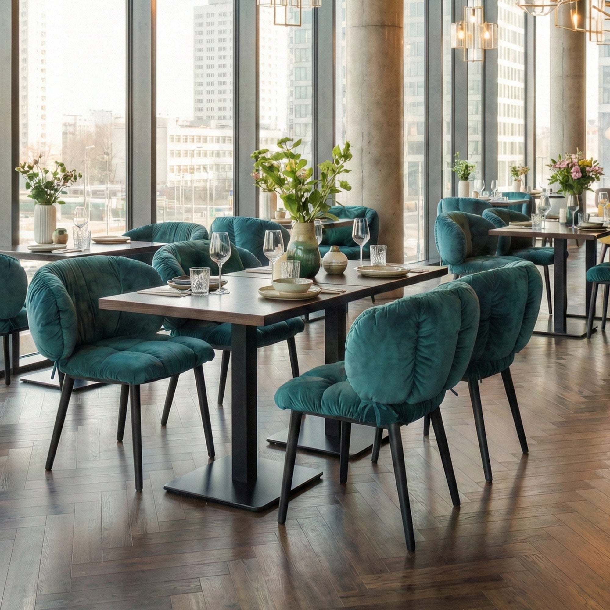 The velvet is rich. These chairs have become my favorite spot for breakfast.