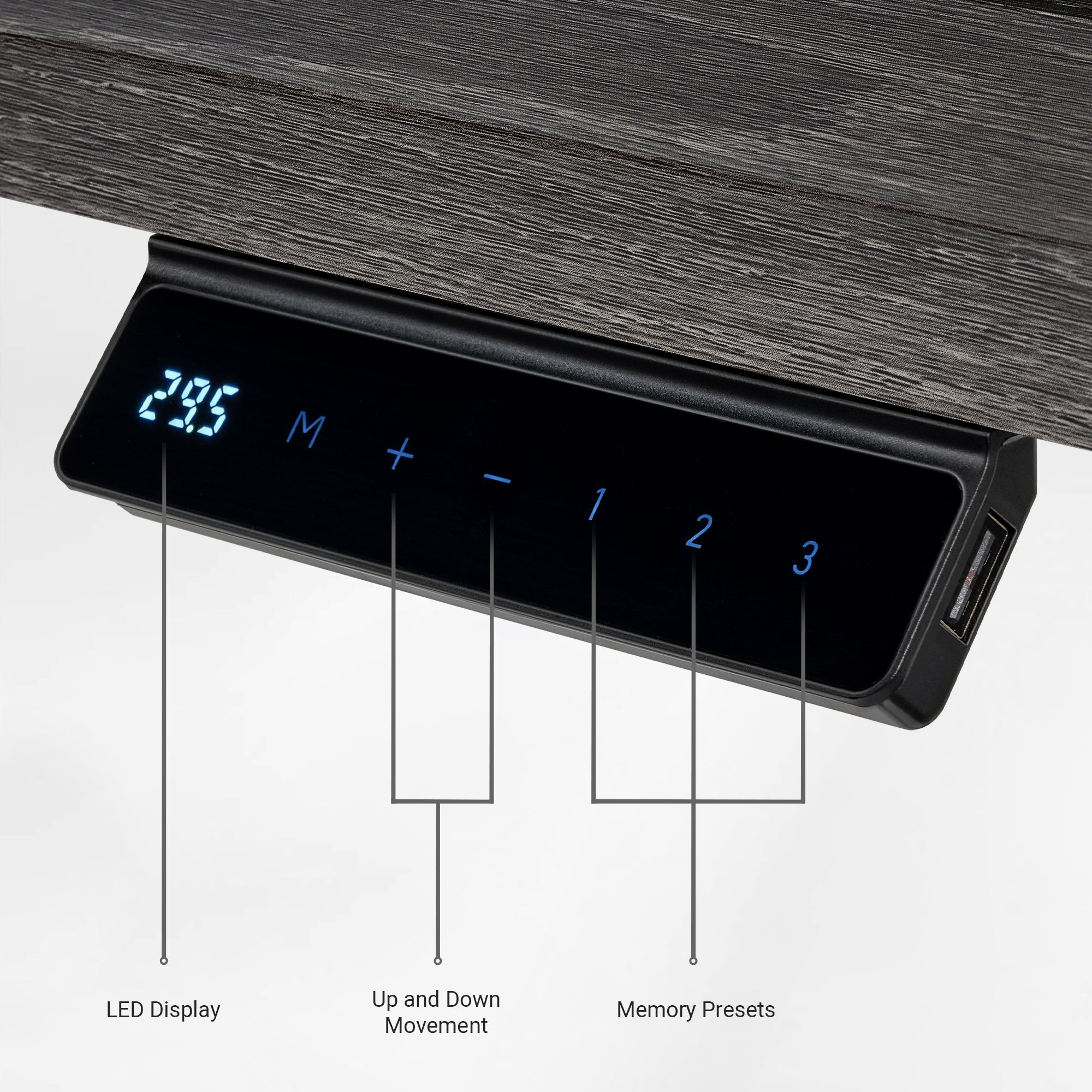 Built-in safety sensor detects items under your desk and immediately freezes motion to prevent damage and injury.